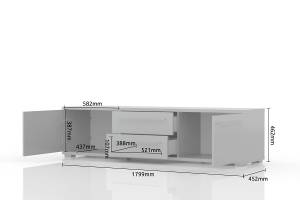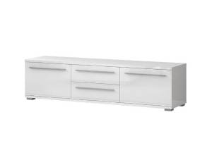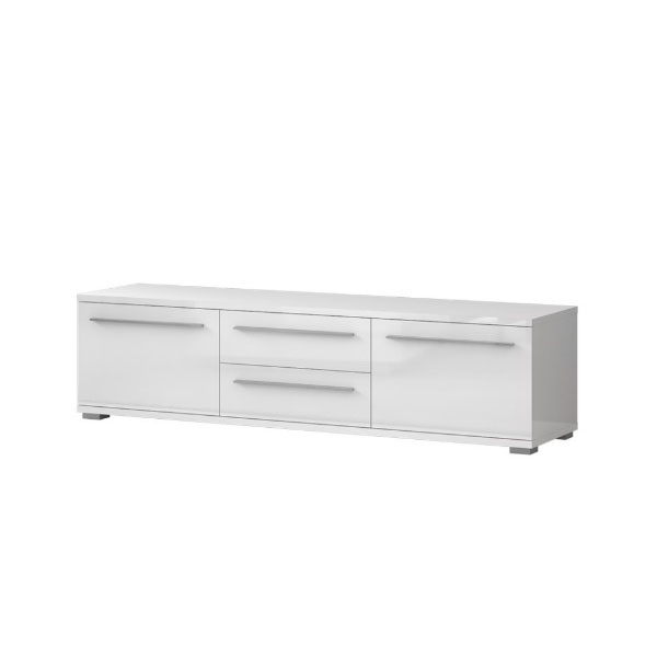 Comoda TV cu 2 usi si 2 sertare PIANO WHITE 180x46x45cm alb lucios, manere si picioare crom