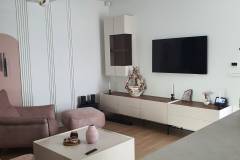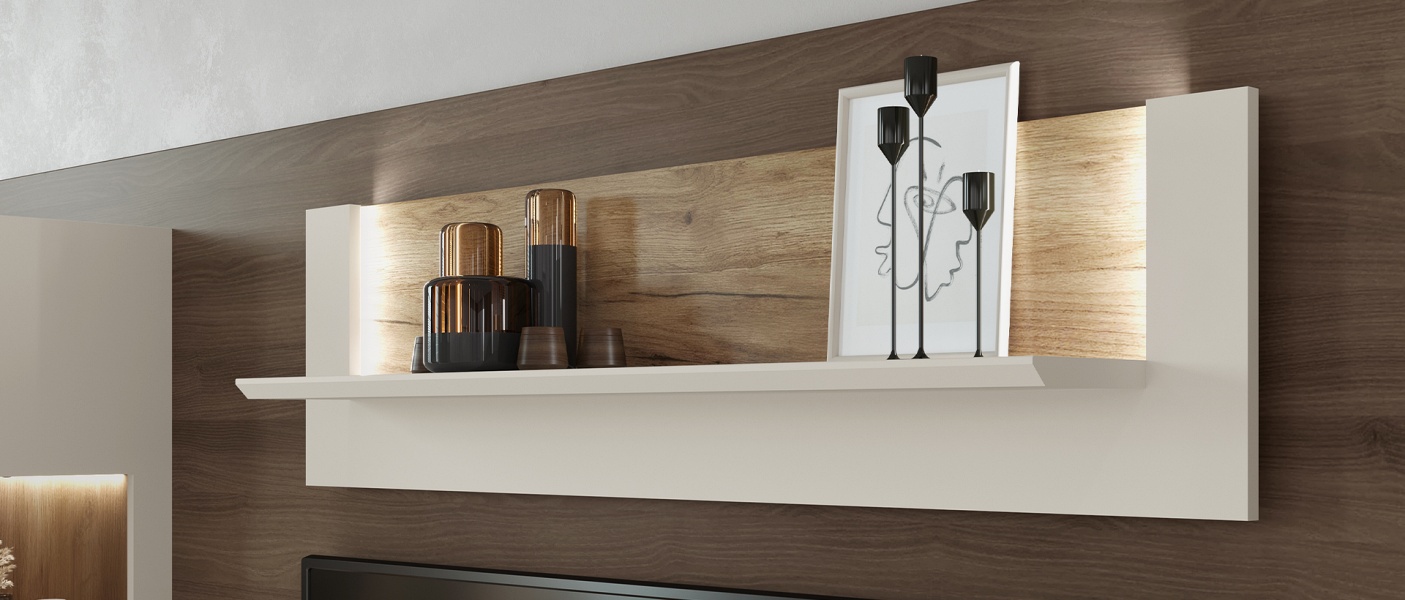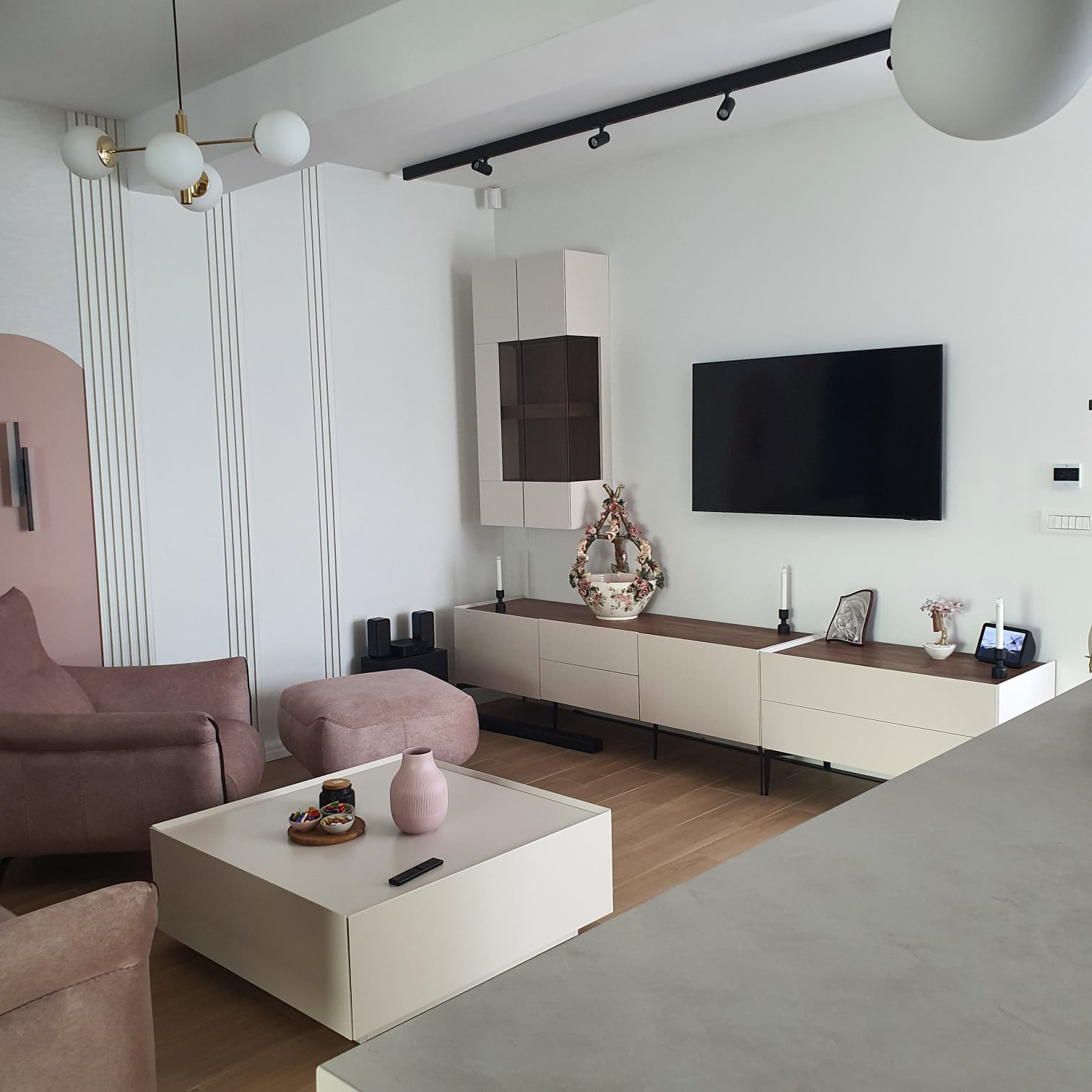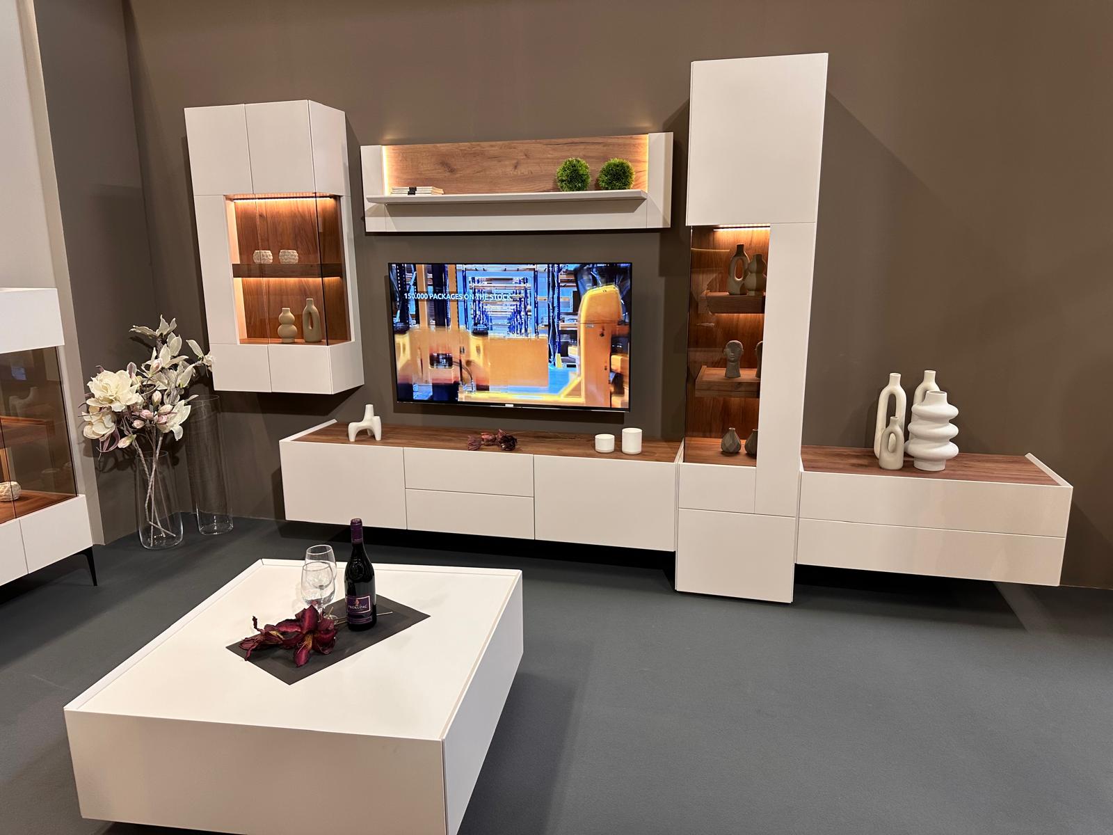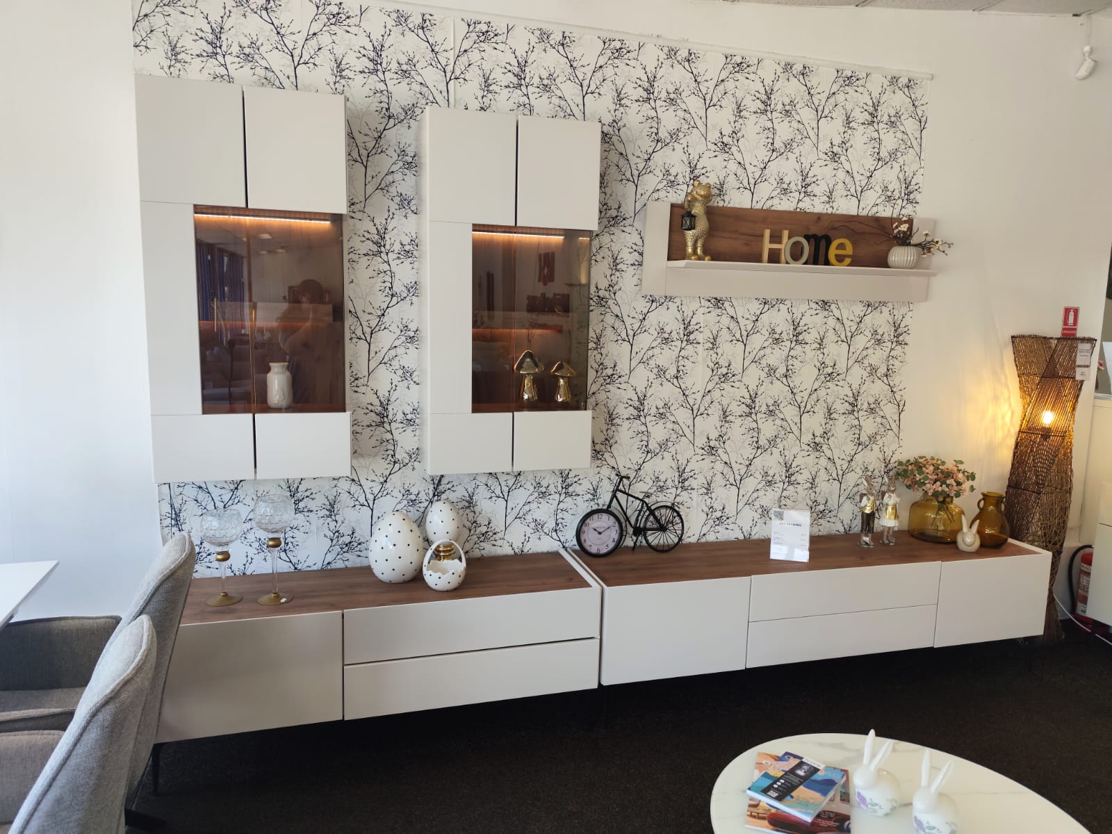 Pretul afisat nu include comoda din lateral, masuta, panoul de pe perete, montajul, alte piese de mobilier si accesoriile din imaginea de prezentare a produsului.