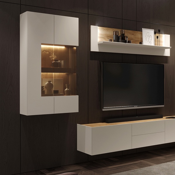 Pretul afisat nu include polita suspendata, comodele tv,comoda din lateral, masuta, montajul, alte piese de mobilier si accesoriile din imaginea de prezentare a produsului.