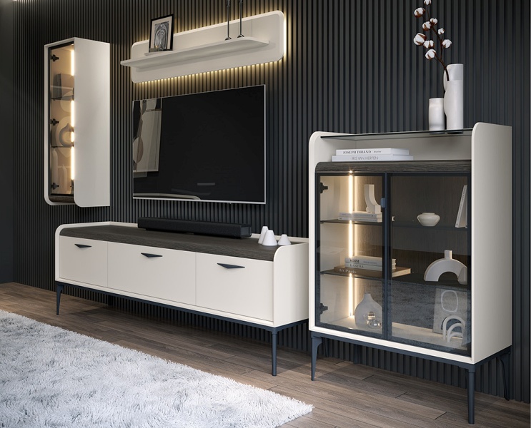 Pretul afisat nu include polita suspendata, comodele tv,comoda din lateral, masuta, montajul, alte piese de mobilier si accesoriile din imaginea de prezentare a produsului.