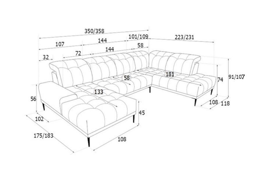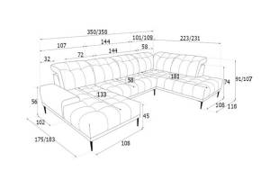 Coltar cu reglaj electric GRENADA U cu tetiere reglabile, personalizabil 231x358x183cm