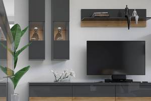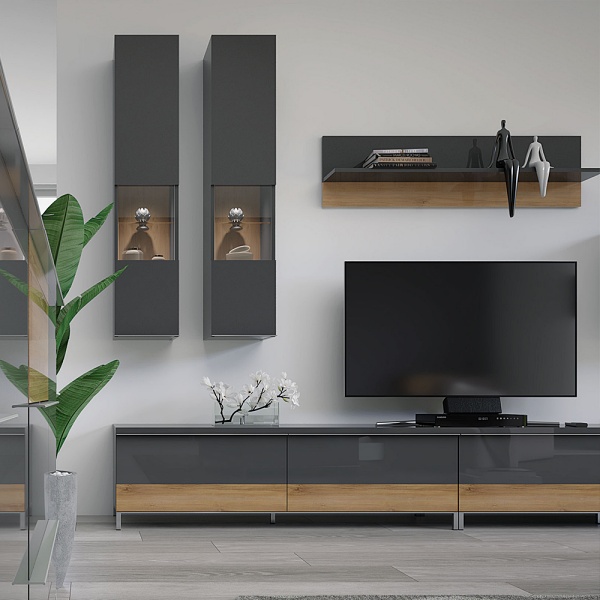 Colectia de living ONYX imbina nuanta antracit cu lemn Nuc Pacific, oferind un design modern si finisaj lucios de impact. Manerele si picioarele in nuanta crom, alaturi de sistemul soft-close, completeaza aceasta colectie eleganta si functionala, perfecta pentru un decor contemporan.