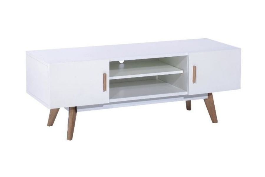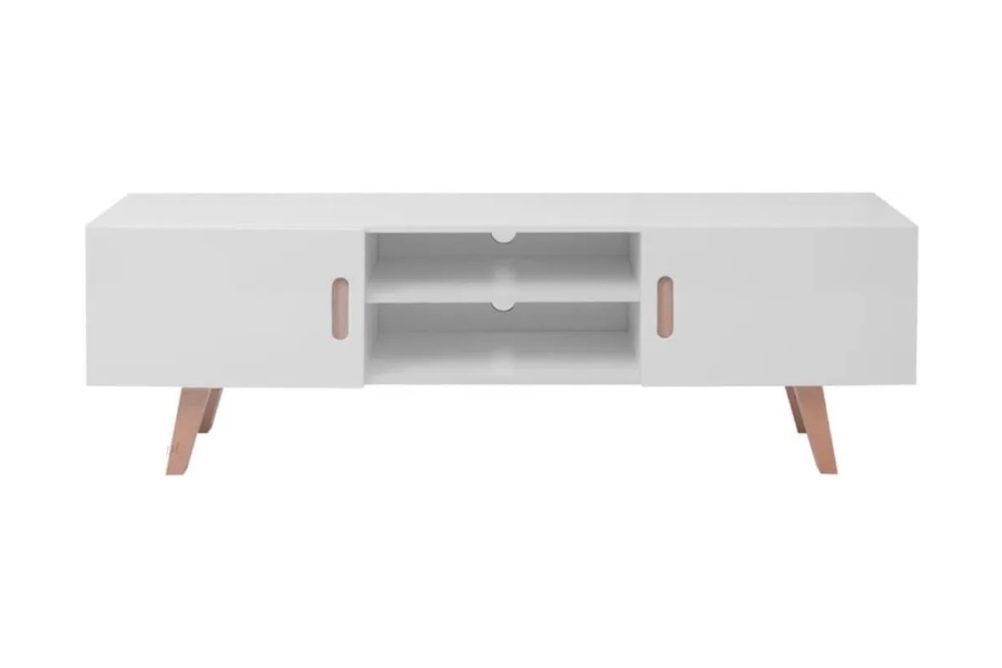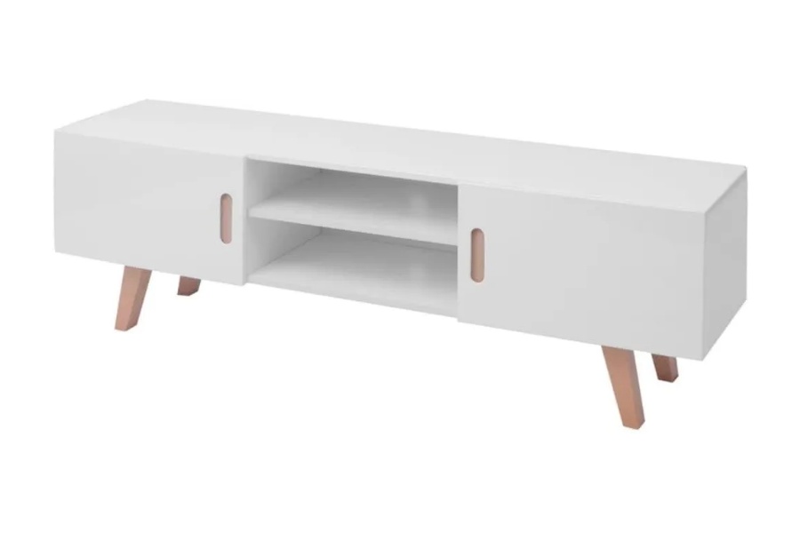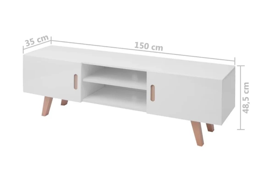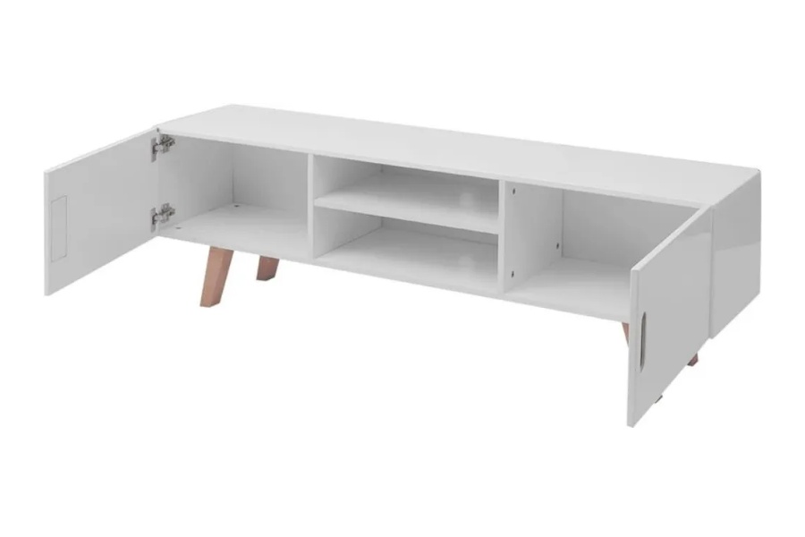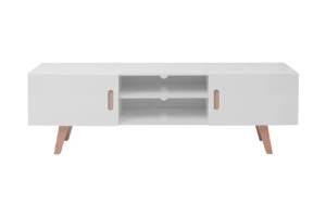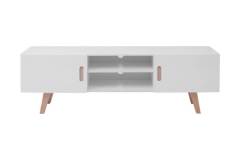 Comoda TV cu 2 usi si spatiu liber MILAN 150x48x35cm alb, picioare si manere fag