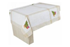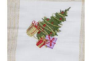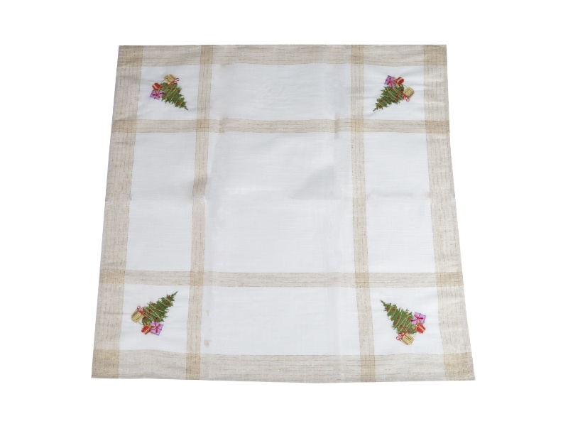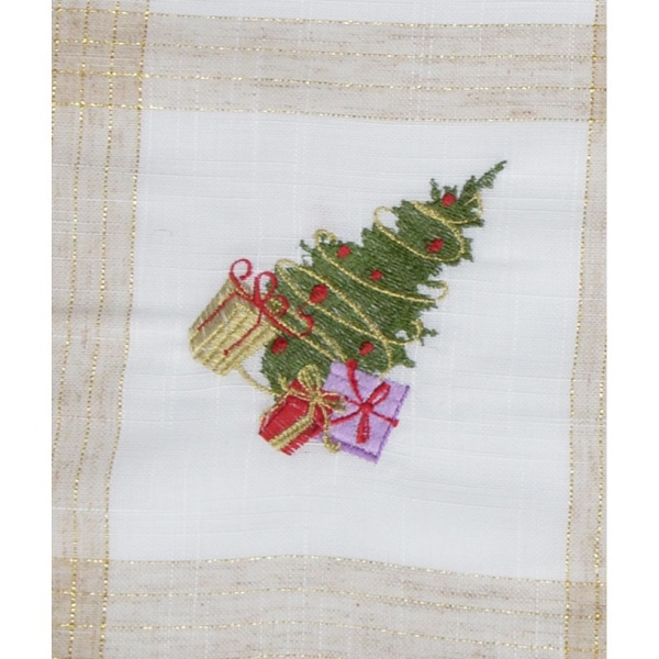 - Nuanta: alb / bej + auriu + multicolor (brad)