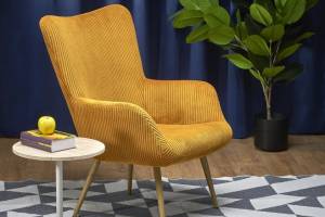Fotoliu AMARO material plusat-raiat curry, picioare nuanta lemnului, design scandinav 70x80xH97cm