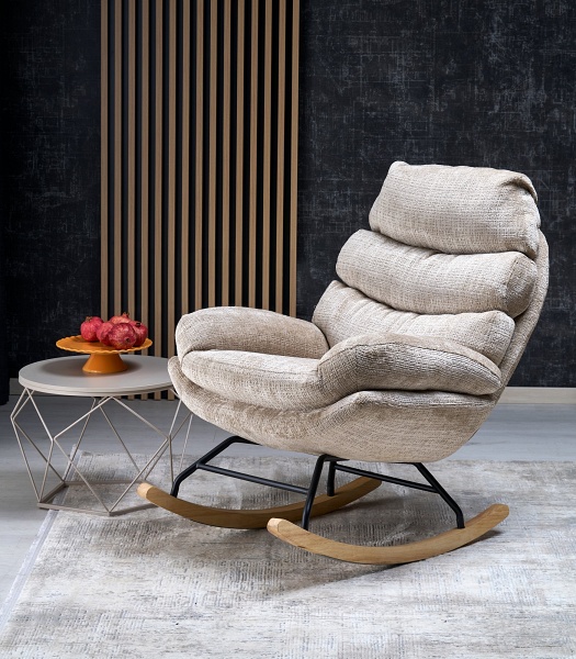Fotoliu GIORGIO cu functie de balansare, material textil plusat beige, picioare nuanta lemnului + negru 75x108xH100cm
