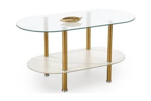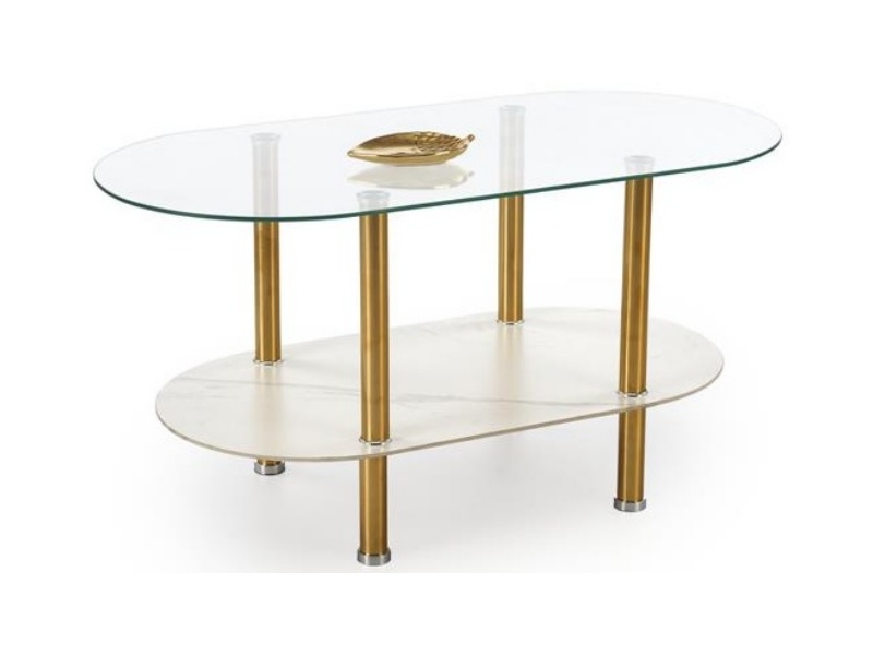 Masuta DUCAT cu spatiu tip suport, din sticla transparenta, sticla cu efect de marmura alba, metal auriu 100x50xH51cm