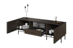 - comoda tv are 3 compartimente din care unul deschis fara usa