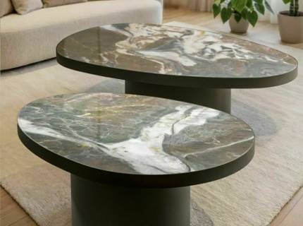 Set 2 masute FLAMINGO Grey din piatra sinterizata cu efect de marmura gri, metal negru 60xH40cm / 80xH46cm
