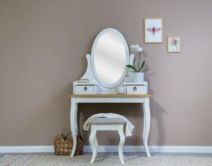Masa de machiaj cu 2 sertare, oglinda si scaun POPRAD 100x160x45cm patina de pin/ maro miere