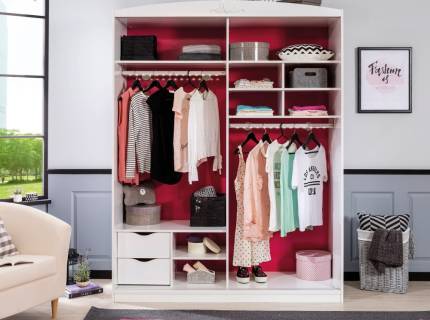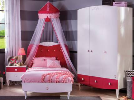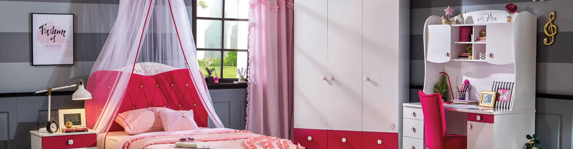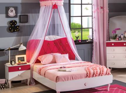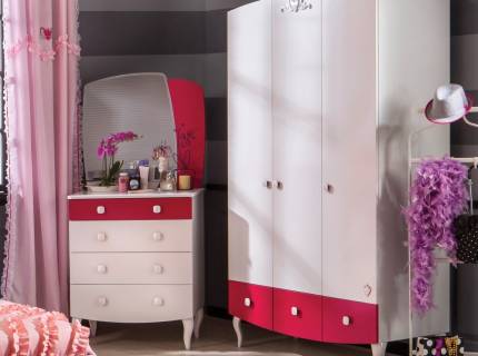 Nuanțe jucăușe de roz și alb, design practic. Oferă-i un dormitor plin de viață și de personalitate copilului tău, apoi privește cum îl va transforma într-un palat!