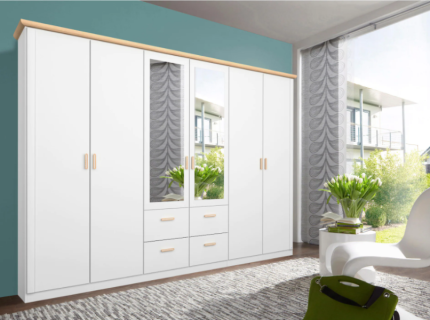 Dulap cu 6 usi cu balamale si 4 sertare KOLDING 277x214x57cm alb alpin/ oglinda, manere si decor frasin Coimbra