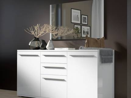 Comoda cu 3 usi si 1 sertar PIANO WHITE 150x85x45cm alb lucios, manere crom