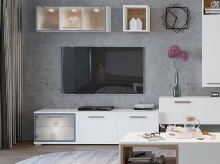 Comoda TV cu 1 usa decor, 1 usa sticla si 2 sertare E5 ALL ROOM CONCEPT 167x45x40cm configurabil