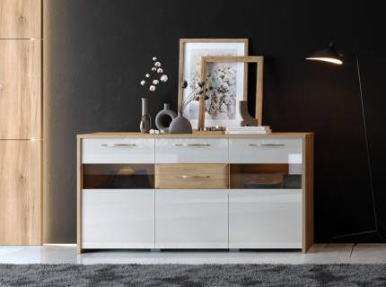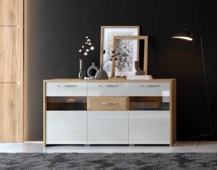 Comoda cu 3 usi cu sticla si 2 sertare GALA 172x85x41cm bej lucios/ nuc Pacific
