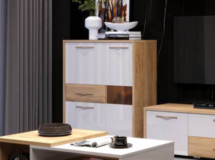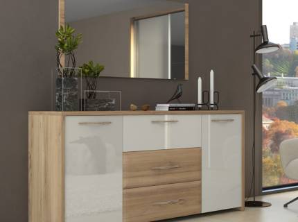 Vitrina lata cu 3 usi si 1 sertar GALA 96x115x41cm bej lucios/ nuc Pacific