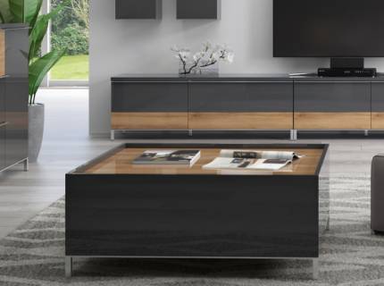 Masuta cu 2 sertare pentru depozitare ONYX 90x90x37cm antracit lucios/ nuc Pacific, picioare crom