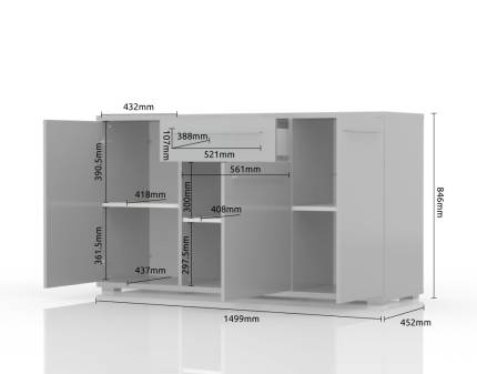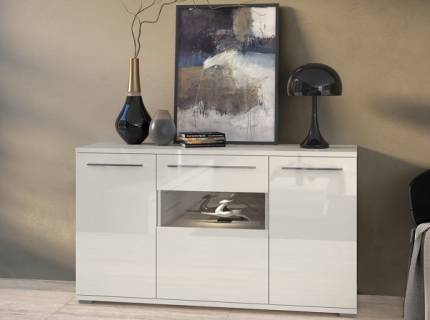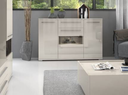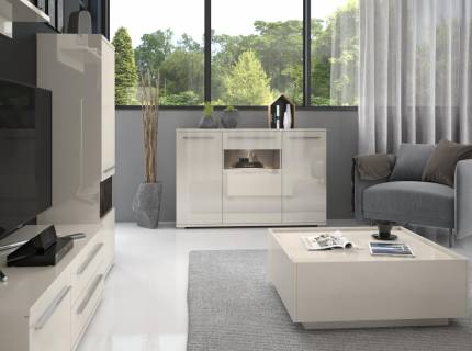 Comoda cu 3 usi si 1 sertar PIANO BEIGE 150x85x45cm bej lucios, manere si picioare crom
