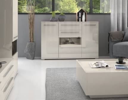 Comoda cu 3 usi si 2 sertare PIANO BEIGE 150x85x45cm bej lucios, manere si picioare crom