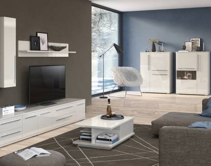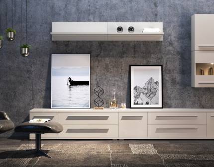 Comoda TV cu 1 usa si 2 sertare PIANO BEIGE 120x46x45cm bej lucios, manere si picioare crom