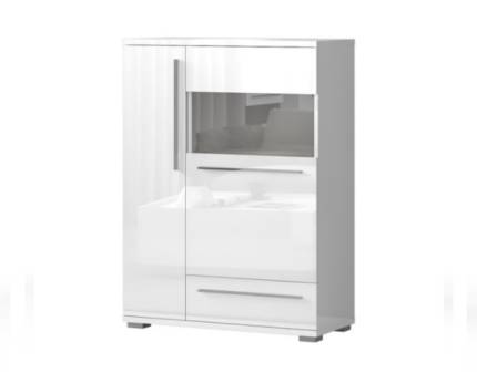 Comoda TV cu 1 usa si 2 sertare PIANO WHITE 135x46x45cm alb lucios, manere si picioare crom