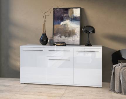 Comoda cu 3 usi si 1 sertar PIANO WHITE 150x85x45cm alb lucios, manere si picioare crom