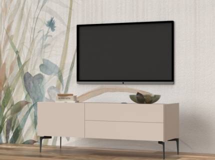 Comoda TV cu picioare negre, 1 usa si 2 sertare SKY 45 147x56x47cm casmir/ stejar tabac